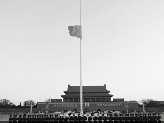 今天,北京天安門、新華門和全國人大常委會、國務院、全國政協、中央軍事委員會、最高人民法院、最高人民檢察院所在地,全國和駐外使領館下半旗志哀,全國停止公共娛樂活動……